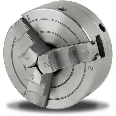 Ce mandrin à trois mâchoires a des mâchoires réversibles qui peuvent être utilisées comme mâchoires extérieures ou intérieures simplement en échangeant les positions des mâchoires 1 et 3.