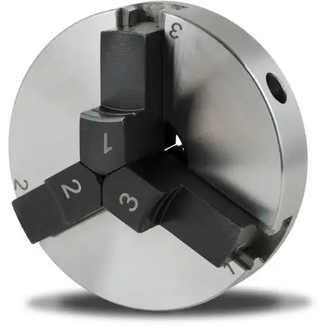Ce mandrin à trois mâchoires a des mâchoires réversibles qui peuvent être utilisées comme mâchoires extérieures ou intérieures simplement en échangeant les positions des mâchoires 1 et 3.