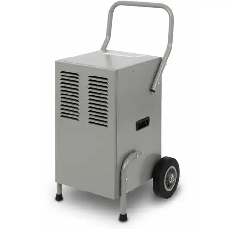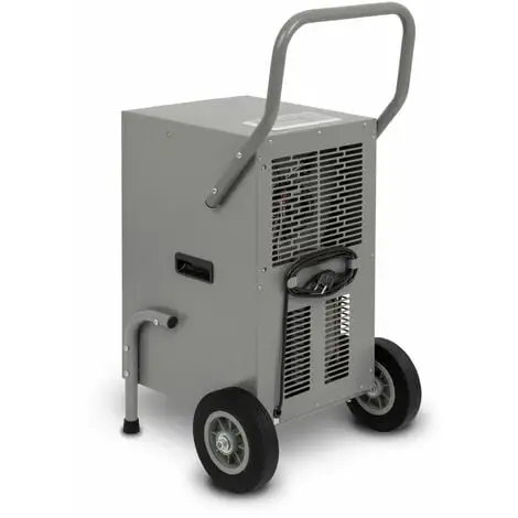 - Le déshumidificateur de chantier robuste est équipé dun châssis stable avec deux roues massives en caoutchouc, ce qui permet de déplacer le déshumidificateur sans problème et confortablement sur tous les chantiers. Le déshumidificateur mesure au total 547 x 391 x 863 mm