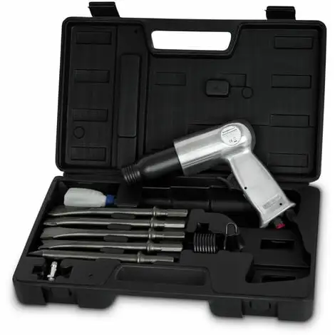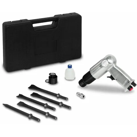 Ce marteau burineur de 175mm à air comprimé peut être utilisé pour tous vos travaux manuels. Le set de 10 pièces comprend un coffre en plastique, tous les burins les plus courants et fout ce dont vous avez besoin pour vous mettre au travail. L´arrivée de l´air comprimé s´effectue au travers d´un raccord rapide. Le burin à air comprimé est idéal pour les ateliers, garage, à domicile ou dans le domaines agricole.
