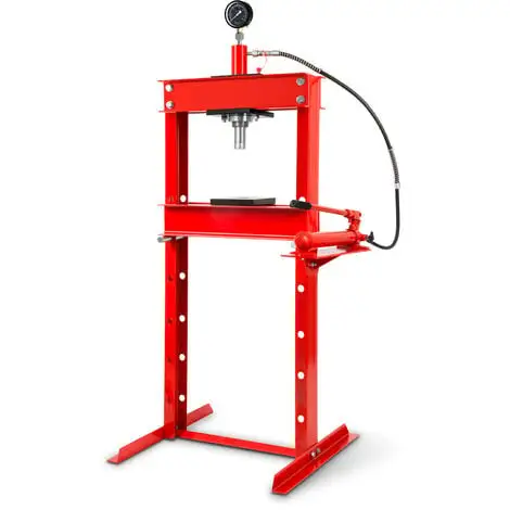 Cette presse datelier 12T est une presse datelier hydraulique à main avec manomètre. Le cylindre hydraulique robuste à un étage permet une force de pression jusquà 12 tonnes. La table de support comprenant les mâchoires de support est réglable en hauteur et le vérin a une rétraction automatique du piston. Lappareil vous permet de travailler de manière fiable, commodément et rapidement.