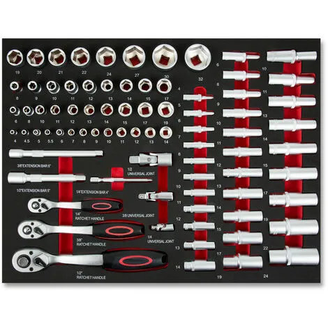 - Clé à cliquet (1/2″, 3/8″, 1/4″) y compris jeu de clés à douille (4-19mm), jeu de clés à douille à profil bas (4-32mm), rallonge (1/2″, 3/8″, 1/4″) & cardan (1/2″, 3/8″, 1/4″)